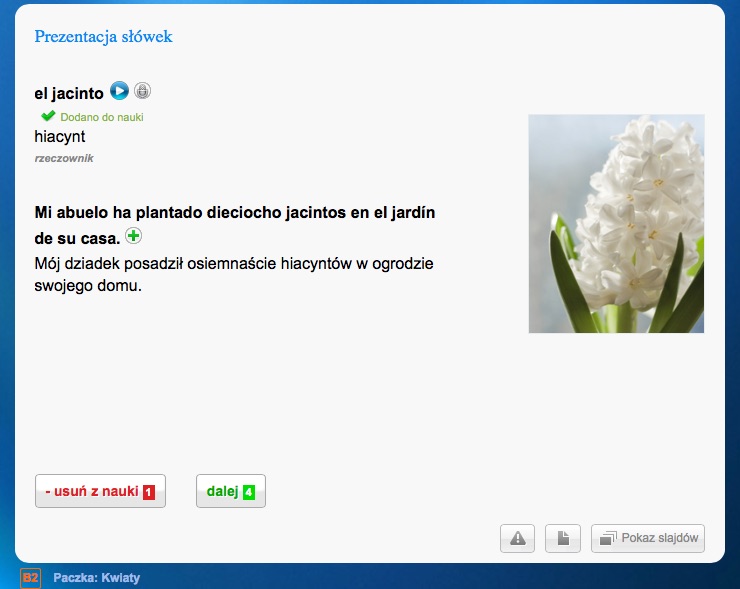 Ćwiczenia trafiają zarówno dla wzrokowców jak i słuchowców. Zaliczam się do obu grup :). Wiele kart opatrzonych jest zdjęciem. W 99% słów dołączone jest również przykładowe zdanie z nagraniem lub bez. W sekcji prezentacji można korzystać z trenera wymowy, czyli nagrać swoją wymowę i porównać ją z oryginalnym głosem native speakera. Daremnie szukać takich urozmaiceń w darmowych programach. Osoby, które dane słowo muszą napisać lub te mające problem z ortografią, będą zadowolone z funkcji dyktanda. W celu lepszego utrwalenia można generować sobie różne gry typu memory itp. Różne pakiety ćwiczeń są też dostępne za darmo na samej platformie.
