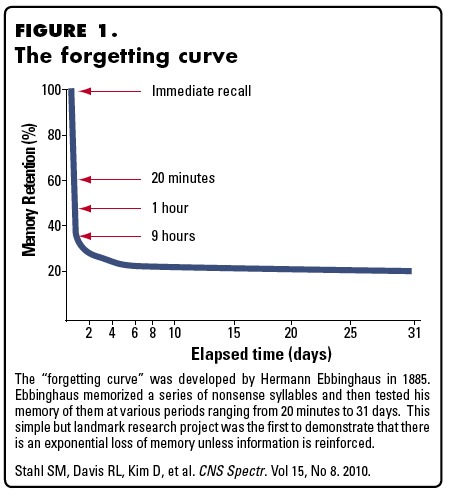 W 1885 roku niemiecki psycholog z Berlina, Hermann Ebbinghaus, przeprowadził eksperyment na człowieku (czyli na sobie). W dużym uproszczeniu Ebbinghaus uczył się pozbawionych sensu sylab (np. cag, gif, waw) poprzez mechaniczne powtarzanie ich i odczytywanie na głos, zwane przez niektórych zakuwaniem. Innymi słowy czytał je tak długo, aż potrafił wyrecytować wszystkie z pamięci bezbłędnie. (To mi przypomina trochę naukę definicji na fizyce w liceum. Dziś myślę – niestety).